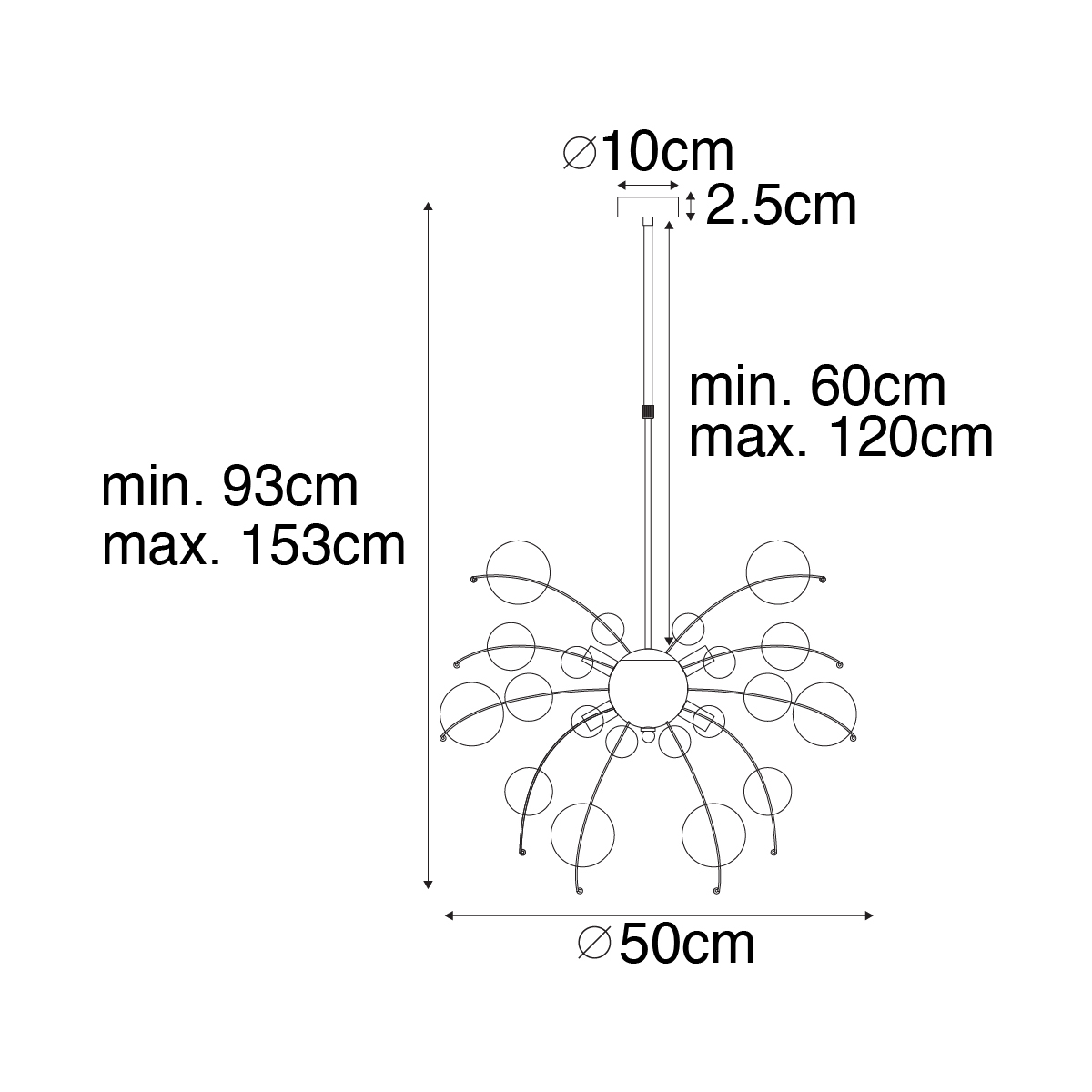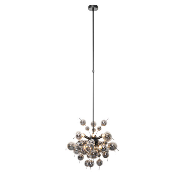 Met hanglamp Explode haal je een uniek exemplaar in huis. Zoals de naam al doet vermoeden geeft de lamp je het idee dat hij explodeert. Met zijn smoke bollen zorgt hij voor extra sfeer in je interieur. Een prachtige hanglamp voor in de woonkamer, eetkamer of werkkamer. De hanglamp is gemaakt van glas met staal en afgewerkt in het zwart. Hij heeft een diameter van 50 cm en een hoogte van 153 cm. De montageplaat heeft een diameter van 10 cm en een hoogte van 2,5 cm. Het snoer heeft een lengte van 120 cm. De smoke kappen hebben ieder een diameter van 6 cm. Maak Explode compleet met 8 lichtbronnen G9 fittingen (max. 28 Watt). Om meer sfeer te creëren kun je de hanglamp aansluiten op een dimmer, deze is niet inbegrepen. Een design hanglamp zoals Explode mag niet ontbreken in jouw interieur.