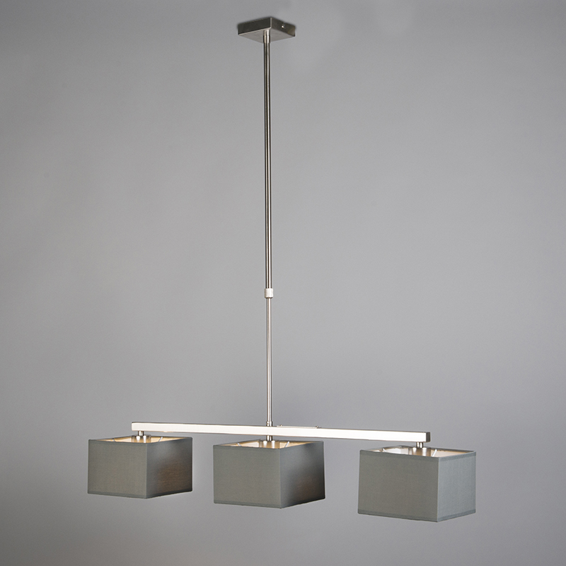 Een tijdloze vierkante hanglamp met een drie vierkante lampenkapjes in een mooie grijze kleur. De stalen basis van deze hanglamp zorgt voor een moderne touch. De hanglamp VT 1 heeft hoogte van 130 cm, een lengte van 88 cm en een breedte van 17 cm. Verder is hij verstelbaar in hoogte: hoogte maximaal: 130 cm, hoogte minimaal 85 cm. De montageplaat heeft een lengte en breedte van 9 cm. De lamp is dimbaar met externe dimmer (dimmer niet inbegrepen). De hanglamp VT 1 heeft drie grote E27 fittingen en wordt exclusief lichtbronnen geleverd, zorg dat je deze er dus nog bij besteld (max. 60 Watt. per lichtbron). Een aangename hanglamp voor boven jouw eettafel in de keuken of woonkamer.