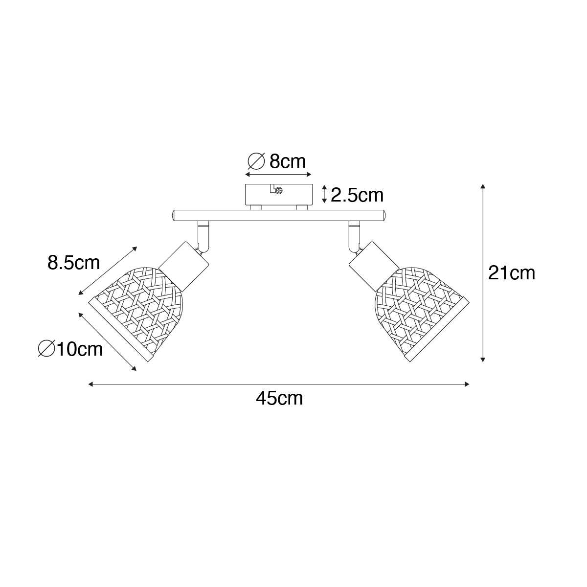 Deze prachtige Rayan spot laat jouw interieur stralen! Dankzij de combinatie van het zwarte staal en de bamboe spots past deze perfect in jouw Oosterse interieur. Door het raster komt de lichtbron mooi uit en zorgt voor leuk lichteffect op de muur. De spot heeft 2 lampenkappen die los van elkaar verstelbaar zijn, hierdoor bepaal jij waar je het licht wil laten schijnen. Verder heeft de Rayan een hoogte van 21 cm, een lengte van 45 cm en een breedte van 10 cm. Je maakt de spot compleet met 2 LED lichtbronnen passend in een kleine E14 fitting van maximaal 25 watt welke je apart bij dient te bestellen.