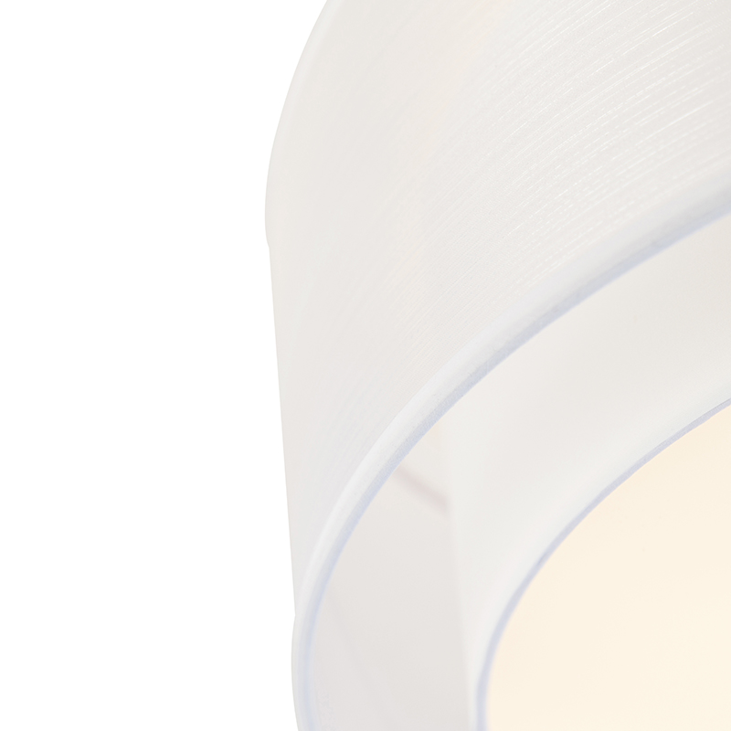 Drum Duo is zoals je al doet vermoeden een lamp met een duo kap. De binnenste en buitenste kap zijn wit, de buitenste kap is doorschijnend. Dit zorgt voor een extra dimensie in de lamp. Doordat de binnenste kap is afgesloten met een opaal plastic plaat, wordt het licht gedempt. Dat zorgt voor een aangename licht beleving. Drum Duo is gemaakt van stof met staal en plastic. Hij heeft een diameter van 50 cm en een hoogte van 32 cm. De montageplaat heeft een diameter van 12 cm en een hoogte van 2,5 cm. Je maakt de plafondlamp af met 3 lichtbronnen met een E14 fitting van max. 40 Watt. Zorg dat je deze er nog los bij besteld. De lamp is dimbaar met een externe dimmer, deze is niet inbegrepen. Drum Duo is een mooie plafondlamp voor in de hal, woonkamer of slaapkamer. Maak het gezellig in huis met Drum Duo.