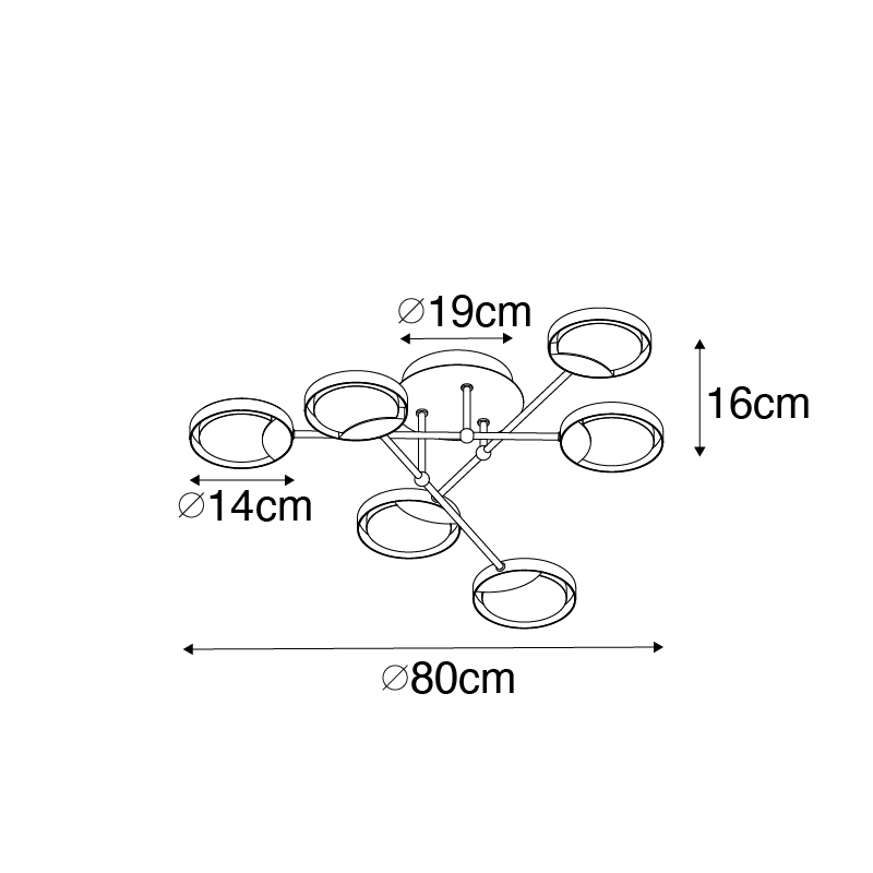 Haal een moderne eyecatcher in huis met Patrick. Deze plafondlamp is gemaakt van kunststof met staal en afgewerkt in een tijdloze zwarte kleur. Hij heeft een diameter van 80 cm en een hoogte van 16 cm. De montageplaat heeft een diameter van 19 cm en een hoogte van 3,5 cm. Deze lamp heeft 6 lichtpunten met LED lichtbronnen die vastzitten in het armatuur. Deze kunnen dus niet vervangen worden. De lamp is dimbaar met een 3-staps dimmer, dat houdt in wanneer je één keer op de lichtschakelaar duwt je 100% licht krijgt, bij een tweede keer 60% en bij een derde keer 30% (sfeer) licht. De dimmer zit er niet bij inbegrepen. Kies voor de juiste sfeer met deze Patrick!