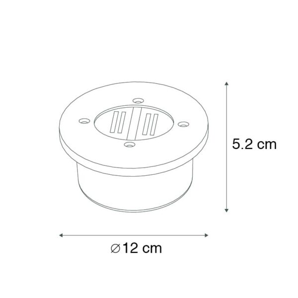 De grondspot Tiny van staal is allereerst met zijn moderne design en zijn strakke afwerking niet alleen een lust voor het oog, de Tiny is daarnaast ook super praktisch en duurzaam. Dit komt omdat hij werkt op zonne-energie; laat de zon dus zijn werk doen! Met een IP-waarde van IP44 is hij perfect bestendig tegen spatwater. De lamp heeft een diameter van 12 cm en een hoogte van 5,2 cm. De inbouw heeft een diepte van 4 cm en een diameter van 10 cm. De lamp heeft een geïntegreerde LED-lichtbron met 1 Watt, 3 lumen en 15000 branduren. De lamp is dimbaar met een externe dimmer (dimmer niet inbegrepen). Maak je tuin of terras compleet met deze mooie grondspot!