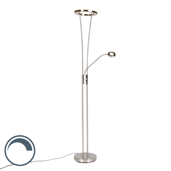 Zeer functionele vloerlamp met leesarm, afgewerkt met staal en glas, is een super mooie sfeermaker in jouw woonkamer of slaapkamer. Een uplighter voor sfeerverlichting en een verstelbare leesarm voor functioneel licht waar je het nodig hebt. Wat wil je nog meer?! Onze Divine heeft een totale hoogte van 180 cm. De voet heeft een diameter van 28 cm. Hij wordt met kabel geleverd waarvan de lengte 190 cm is. Beide lampen zijn afzonderlijk van elkaar te bedienen. De leesarm is zeer makkelijk verstelbaar; handig bij het lezen! De vloerlamp beschikt over een uplighter (diameter van 30 cm) inclusief LED (geïntegreerd in het armatuur). Dit LED heeft een lichtopbrengst van 3000 Kelvin en 1800 lumen. De leesarm beschikt over 400 lumen en 3000 Kelvin. Deze lichtpunten zijn afzonderlijk van elkaar dimbaar. Het is een lamp waar je langdurig plezier van krijgt (30.000 branduren). Een super functionele vloerlamp om te lezen en dankzij de dimfunctie op de lamp wordt het een sfeermaker in je interieur!